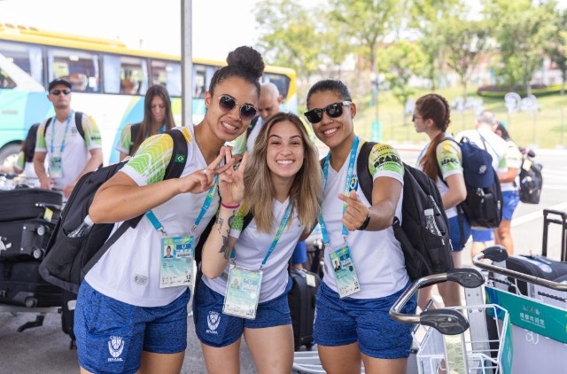 7月22日,巴西代表團成員抵達成都大運村后合影。