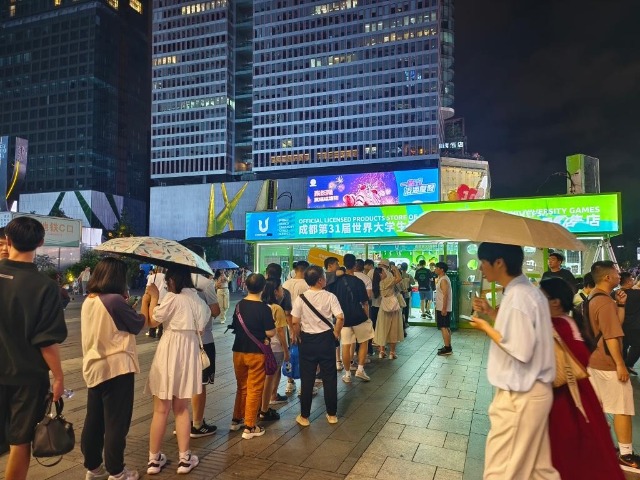 7月27日,人們在成都市一家成都大運會特許商品零售店門前排隊。