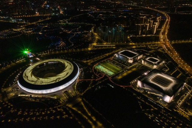 這是成都東安湖體育公園內的第31屆世界大學生夏季運動會開幕式主體育場(左)、主火炬和三個運動場館(4月19日攝,無人機照片)。新華社記者 沈伯韓 攝
