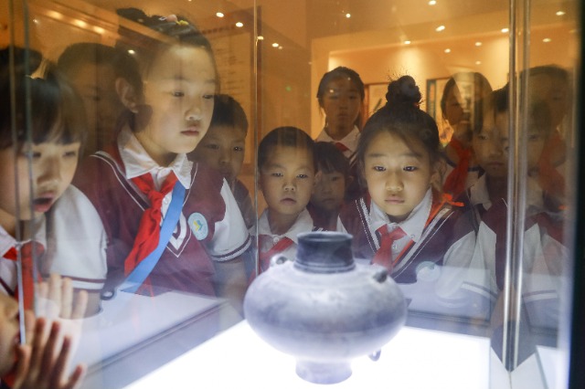 2023年7月25日,在山東省青島市李滄區新時代文明實踐中心,孩子們參觀李滄區博物館陳列的龍山文化黑陶罍。通訊員 張鷹 攝