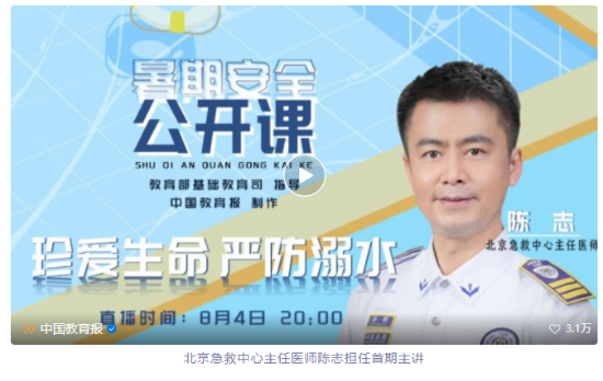 北京急救中心主任醫(yī)師陳志結(jié)合案例,講解溺水預(yù)防和急救常識(shí),為廣大師生和家長(zhǎng)上了生動(dòng)的一課,全國(guó)上千萬(wàn)師生家長(zhǎng)在線收看?!?a href="http://m.zhmqcg.com/rmtzgjyb/202308/t20230808_2111078304.html" target="_blank">詳細(xì)】