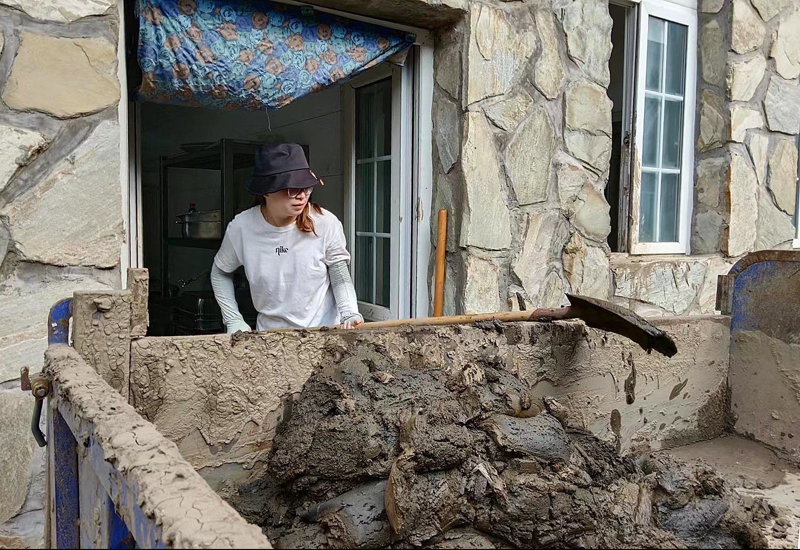 8月23日,淶水縣龍門小學老師在清理宿舍淤泥。