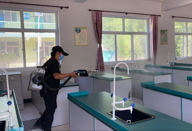 淶水縣其中口小學(xué)老師對實驗室進行消殺。