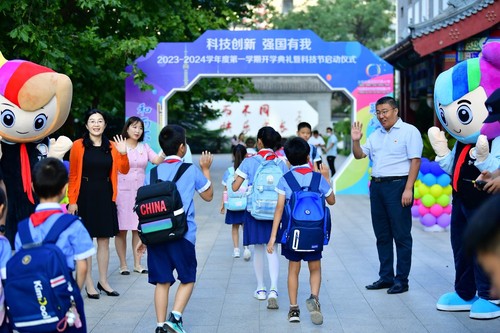 中國教育報(bào)-中國教育新聞網(wǎng)訊(通訊員 李典)9月1日,北京市海淀區(qū)民族小學(xué)新學(xué)期開學(xué)典禮暨科技節(jié)啟動儀式舉行。典禮以“科技創(chuàng)新,強(qiáng)國有我”為主題。現(xiàn)場儀式感滿滿、科技氛圍感十足。操場兩側(cè),舞臺前方的紅毯上,家長和老師共同撐起“愛心傘”,迎接一年級的新生入場。“愛心傘”由美術(shù)老師帶領(lǐng)高年級的哥哥姐姐們親手繪制,飽含民小全體師生對新生們滿滿的愛意和祝福。