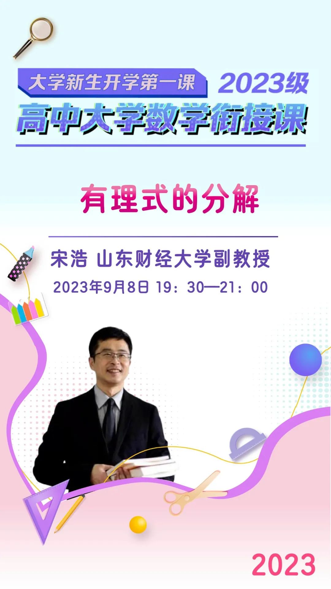 9月8日19:30-21:00,在《2023級(jí)大學(xué)生新生開(kāi)學(xué)第一課·高中大學(xué)數(shù)學(xué)銜接課》第十五期,山東財(cái)經(jīng)大學(xué)宋浩副教授將為同學(xué)們帶來(lái)《有理分式的分解》課程。