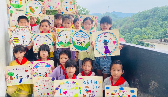 江西于都縣的孩子們展示他們的繪畫作品。杜素華 攝