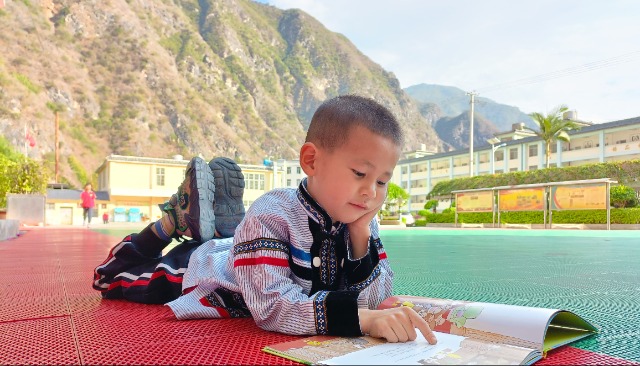 云南怒江瀘水市大興地鎮的孩子趴在操場上閱讀圖畫書。王紹晶 攝