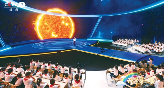 2023年《開(kāi)學(xué)第一課》以“強(qiáng)國(guó)復(fù)興有我”為主題,從傳統(tǒng)文化、文明探源、生態(tài)文明、鄉(xiāng)村振興、國(guó)防教育、科技創(chuàng)新等多個(gè)方面,全景展示中國(guó)式現(xiàn)代化的萬(wàn)千氣象。圖為中國(guó)科學(xué)院高能物理研究所研究員、“拉索”(LHAASO)首席科學(xué)家曹臻在向同學(xué)們介紹世界上海拔最高、規(guī)模最大的宇宙射線觀測(cè)裝置“拉索”的前世今生。(教育部供圖)
