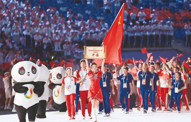 2023年7月28日,第31屆世界大學(xué)生夏季運(yùn)動(dòng)會(huì)開(kāi)幕式在成都東安湖體育公園主體育場(chǎng)舉行。圖為中國(guó)大學(xué)生體育代表團(tuán)在開(kāi)幕式上入場(chǎng)。(新華社記者 王曦/攝)