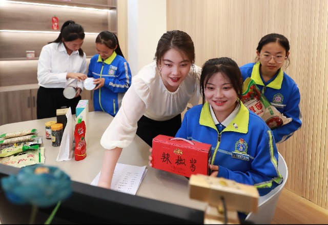 電子商務坊,教師王夢飛(中)和學生一起參與直播帶貨,引導學生關注評價反饋,不斷提升吸引力。