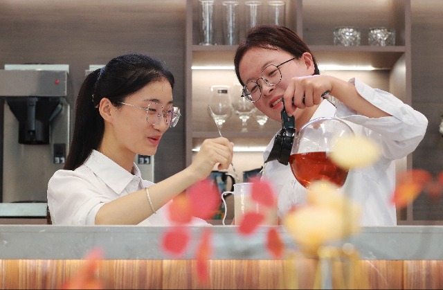 中國教育報-中國教育新聞網訊(通訊員 尹曉軍 記者 張學軍)伴隨著古典清雅的音樂,“茶藝師”身著漢服,氣定神閑、舉止優雅,溫具、置茶、沖泡、奉茶……一雙巧手在茶席間流轉,一低頭一舉杯,精妙的茶藝、醇厚的茶香,讓人流連忘返。