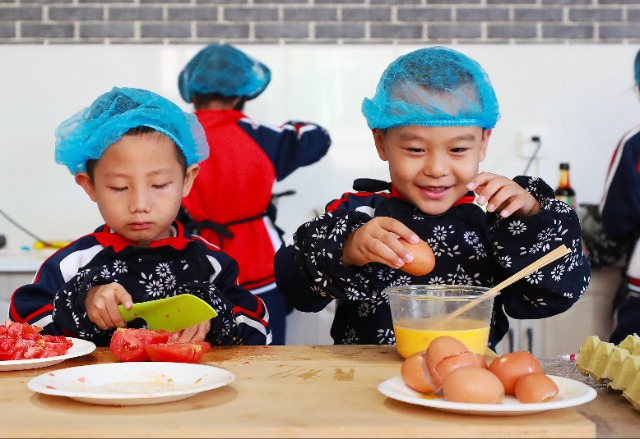 打雞蛋、切西紅柿,敦煌市幼兒園為西紅柿炒雞蛋做準備。