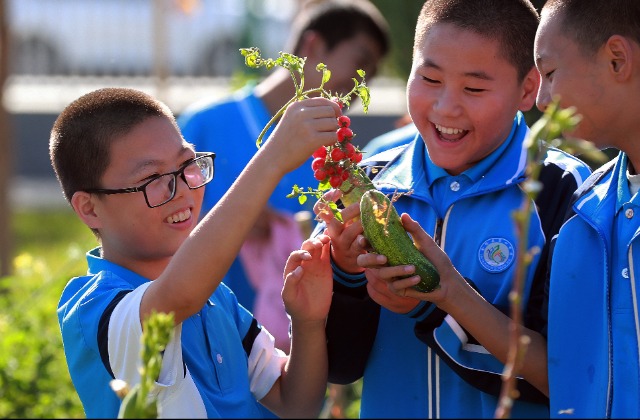 9月27日,在金塔縣第四中學的開心農場,七年級學生比拼自己的采摘成果。
