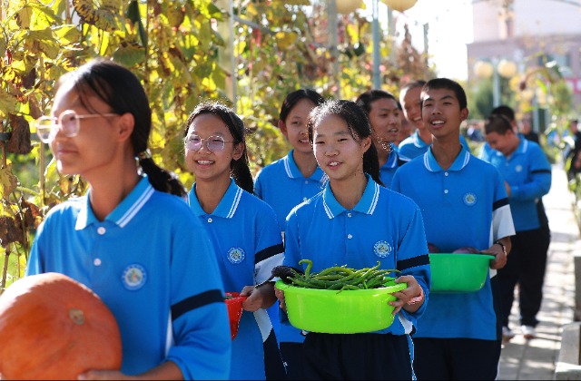 9月27日,金塔四中學生們將采摘的蔬菜送往食堂。