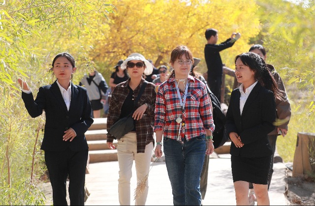 而對于何霞博來說,這也是第一次到胡楊林參加研學活動,給她提供了除教室、實訓室以外的更寬廣的展示平臺,“我很榮幸能以所學的專業(yè)知識,向各位游客朋友們介紹家鄉(xiāng)的胡楊林,讓人們知道在大漠戈壁的深處,還有這樣一片人間仙境?!?/p>