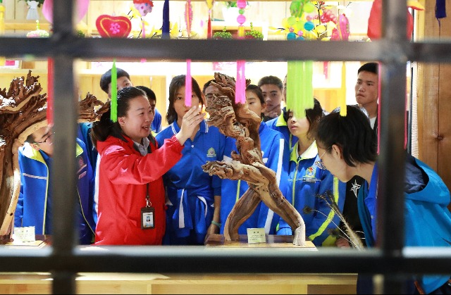 9月27日,在胡楊研究院,金塔文旅集團行政管理部副部長李濤(左二)給金塔汽修中專學生講解胡楊樹雕。