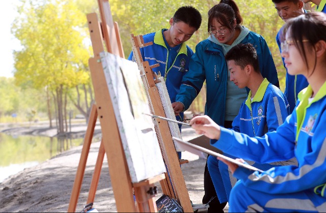 每年這時候,金塔汽車維修中等專業(yè)學校的師生都會如期而至,既是研學活動,也是該?!肮そ彻?jié)”活動的延續(xù)。學生或在湖邊寫生,或展示舞蹈,或給游客講解,或當志愿者引導游客、撿拾垃圾,還在景區(qū)講解員的帶領下走進胡楊林研究中心,深入了解這里的人文歷史,近距離感受胡楊精神。