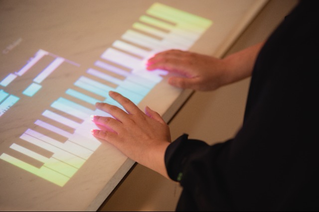 “印跡”設有兩個投影鍵盤,為不同年齡、不同音樂水平的觀眾提供簡短創作的機會,完成的作品會在多媒體墻面上以傳統五線譜的形式呈現出來,同時后臺還會將樂譜轉換成一段音頻,參觀者可以用手機掃描對應的二維碼以保存或展示自己的創作。不僅如此,參觀者還可以在此創作視覺藝術作品,盡情發揮自己的想象力和創造力。