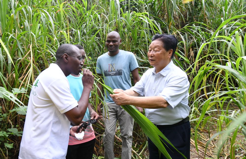 福建農(nóng)林大學(xué)國(guó)家菌草工程技術(shù)研究中心首席科學(xué)家林占熺(右一)在福建農(nóng)林大學(xué)菌草園讓尼日利亞留學(xué)生試嘗幼嫩菌草的味道(2021年8月12日攝)。新華社記者 林善傳 攝