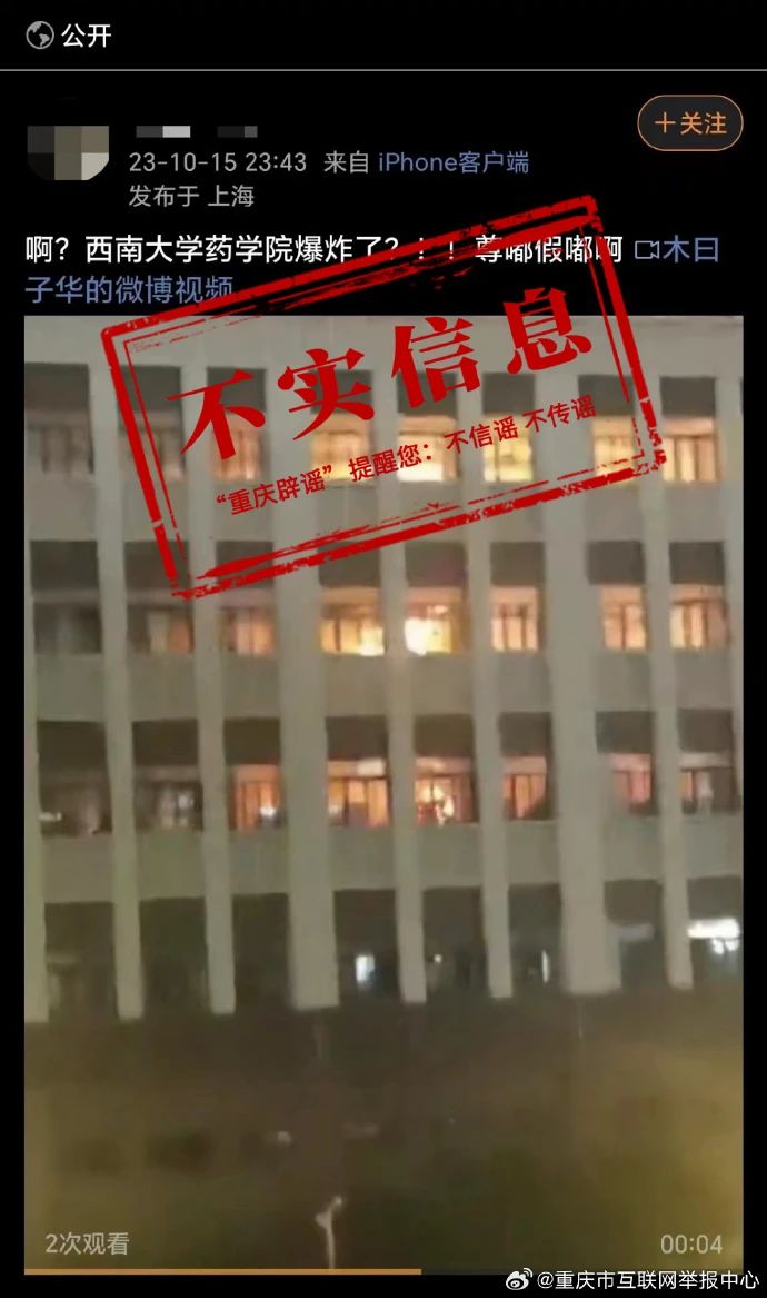 10月16日,重慶市互聯網舉報中心官方微博對此進行辟謠:經向西南大學校方求證,此為不實信息。學校注意到該情況后,立即通知相關部門對每個樓層進行排查,未發現任何爆炸相關情況。目前,該條微博信息已無法正常打開,謠言線索已轉交相關部門進一步核查。