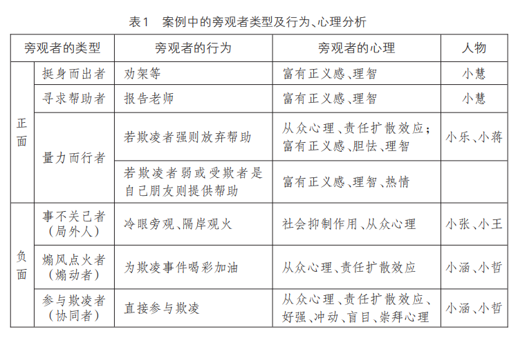 結合上面案例及學校相關欺凌事件分析,筆者認為旁觀者大致可分這么幾類(見表1):