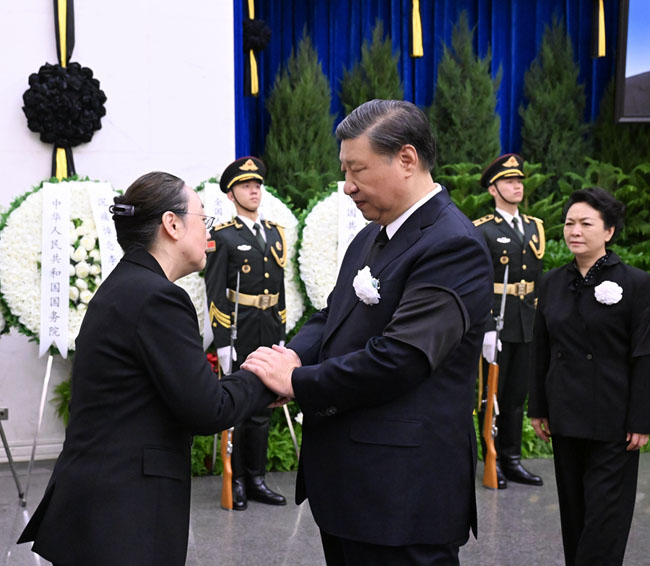 上午9時許,習近平和夫人彭麗媛,李強、趙樂際、王滬寧、蔡奇、丁薛祥、李希、韓正等,在哀樂聲中緩步來到李克強同志的遺體前肅立默哀,向李克強同志的遺體三鞠躬,并與李克強同志親屬一一握手,表示慰問。胡錦濤送花圈,對李克強同志逝世表示哀悼。