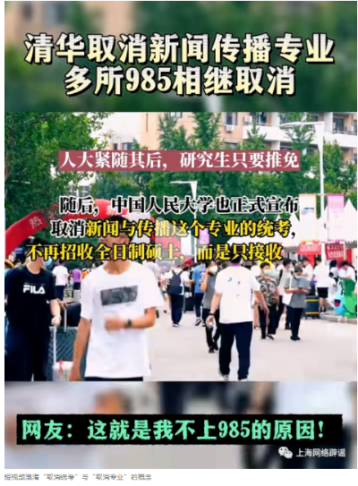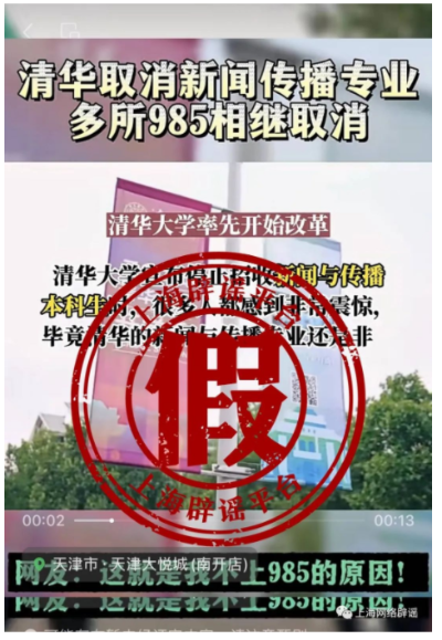 “清華取消新聞傳播專業(yè),多所985相繼取消”的消息受到擬報考新聞傳播學專業(yè)的學子關注。可上海辟謠平臺核查發(fā)現(xiàn),短短13秒的視頻里有4處事實差錯——