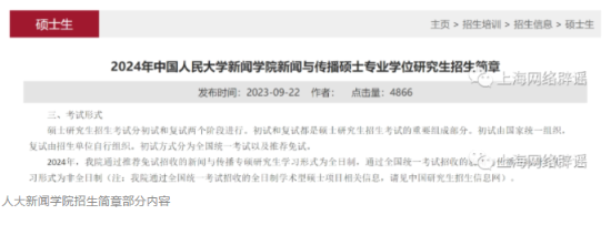核查更是發(fā)現(xiàn),人大“取消統(tǒng)考”也是錯誤的。根據(jù)人大新聞學院發(fā)布的《2024年中國人民大學新聞學院新聞與傳播碩士專業(yè)學位研究生招生簡章》,該校新聞傳播學的專碩研究生既有“推免”的,也有“全國統(tǒng)一考試”的,區(qū)別在于“2024年,我院通過推薦免試招收的新聞與傳播專碩研究生學習形式為全日制,通過全國統(tǒng)一考試招收的新聞與傳播專碩研究生學習形式為非全日制”。