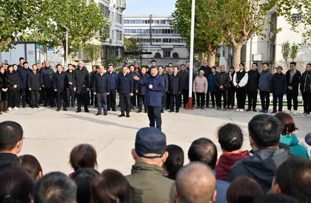 11月10日,中共中央總書記、國家主席、中央軍委主席習近平在北京、河北考察災后恢復重建工作。這是10日下午,習近平在河北保定涿州市雙塔街道永濟秀園小區考察時,同小區居民們親切交流。新華社記者 殷博古 攝
