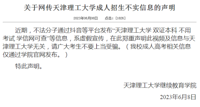此前,天津理工大學繼續教育學院已在官網發布過聲明,聲明全文如下: