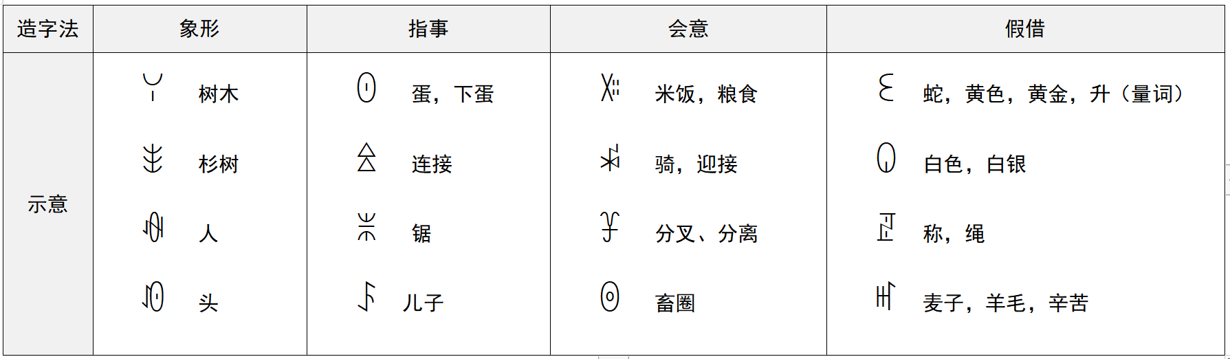彝文造字法與漢字“六書”相符,也可以按照“象形、指事、會意、假借、形聲和轉注”進行分類(如表1)。象形造字在彝文中的比例較大,指事造字、會意造字也比較常見。彝文中假借的使用比漢字更為普遍,不僅存在同音假借,也存在近音假借。彝文假借字既是一種造字法,也拓展成了用字法,所以在閱讀彝文時,要根據上下文的意思,才能判斷出每個字在此時此地所表達的內容。除此之外,古彝文還有形聲和轉注造字法,由于書寫不便,不作列舉和闡述。