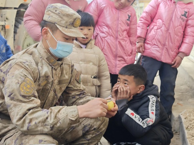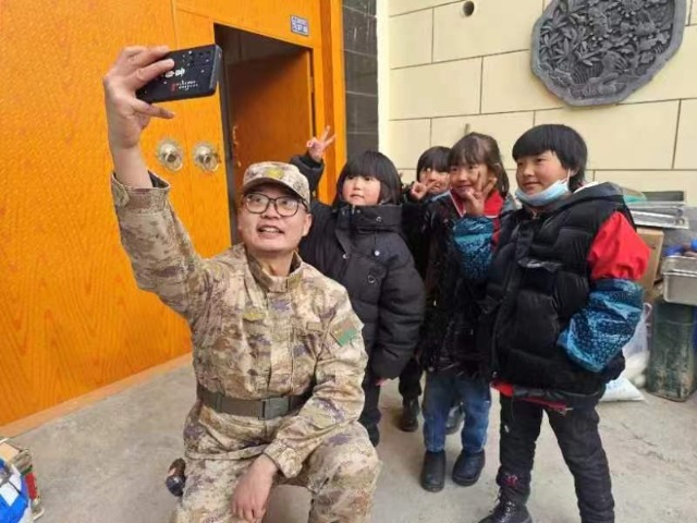 另一邊,輪崗休息的隊員剛拿起手機就被幾個小女孩圍了起來,想要自拍一張。救援隊員立刻蹲下來,拿著手機和大家一起自拍。盡管只認識了不到兩天時間,可心卻在寒冬里緊緊貼在一起……隊員們除了每天做好保障工作,還會輪流抽空給聚在廣場上的小朋友講國防知識,對他們進行愛國主義教育。