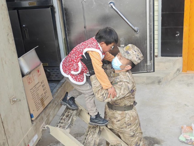 12月20日中午12:40,午飯時間剛過,甘肅省積石山縣劉集小學六年級學生馬藝龍在街道廣場上和幾個同學打乒乓球。球臺后邊的保障餐車吸引了他的注意力,那有幾位他剛認識的大朋友。