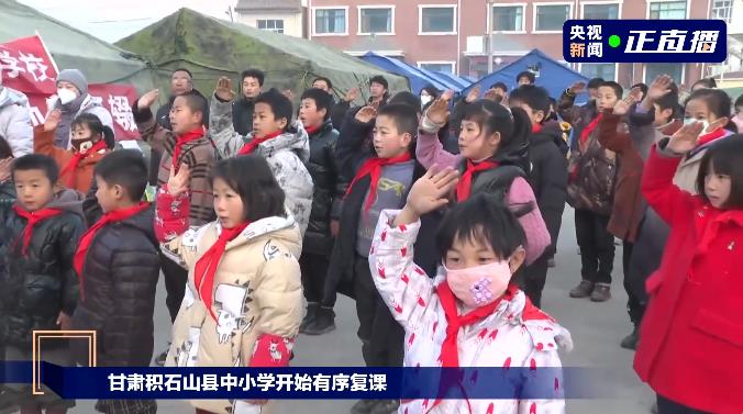12月25日,甘肅省積石山縣中小學有序復課,積石山縣152個帳篷小學全部開課。1136名教師下沉安置點開展教學活動。早上8:30,在大河家鎮集中安置點的帳篷小學前面,41名學生和10名老師共同舉行了簡單而隆重的升旗儀式。其他的帳篷學校也會根據各自情況,舉行升旗儀式。