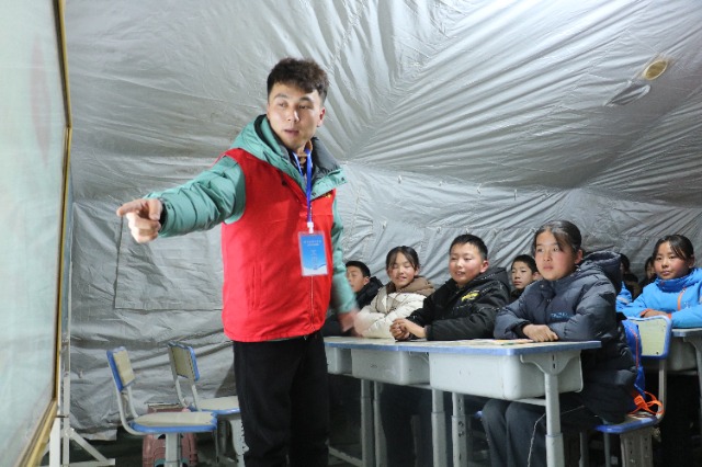 看著帳篷里輔助教學的馬明義,看看電子大屏上遠在臨夏市的石沐瓊和聽課的大哥哥大姐姐,帳篷里坐得最端正的劉集小學六年級學生王煜顯得格外積極:“我沒想到自己在‘帳篷學校’也能用電子設備上課,甚至是與遠在臨夏市的老師同學一起上課。有時晚上我和小伙伴們還擠在帳篷里,用電子大屏聯網看動畫片、體育比賽,感覺特別好。”