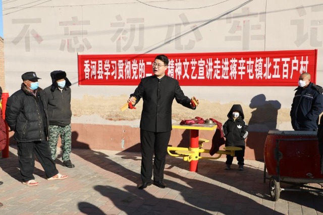 河北省香河縣文化館的文藝工作者張鑫銘在香河縣蔣辛屯鎮(zhèn)北五百戶村進行黨的二十大精神“快板宣講”(2022年12月13日攝)。新華社發(fā)