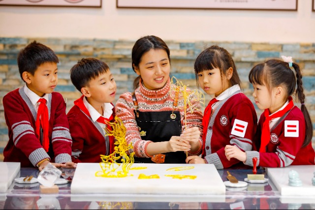 近日,在福建省福州市鼓樓區鼓西街道達明小學,文化志愿者正在指導孩子們體驗非遺項目糖畫的制作,讓學生們感受到中華優秀傳統文化的魅力。謝貴明 攝