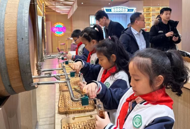 行進(jìn)間,學(xué)生們深度參與學(xué)校與基地一對(duì)一開發(fā)的省級(jí)優(yōu)秀研學(xué)旅行課程《探秘大馬路56號(hào)》。在學(xué)校小講解員的帶領(lǐng)下,大家參觀各個(gè)展廳、探秘百年地下大酒窖,一同體驗(yàn)百年張?jiān)F髽I(yè)文化及創(chuàng)辦人創(chuàng)業(yè)心路歷程,切身感受百年張?jiān)5募覈?guó)情懷;在二樓實(shí)踐體驗(yàn)廳,學(xué)生體驗(yàn)了“用印章組合張?jiān)9纠祥T頭”“自制灌裝白蘭地酒”,在實(shí)踐中感受釀酒工藝中追求卓越的工匠精神。