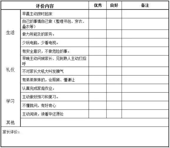 家?;拥姆绞接泻芏喾N,推薦一種表格的形式,以幫助家長督促孩子良好習慣的養(yǎng)成,另一方面也給教師一個了解學生動態(tài)的渠道。