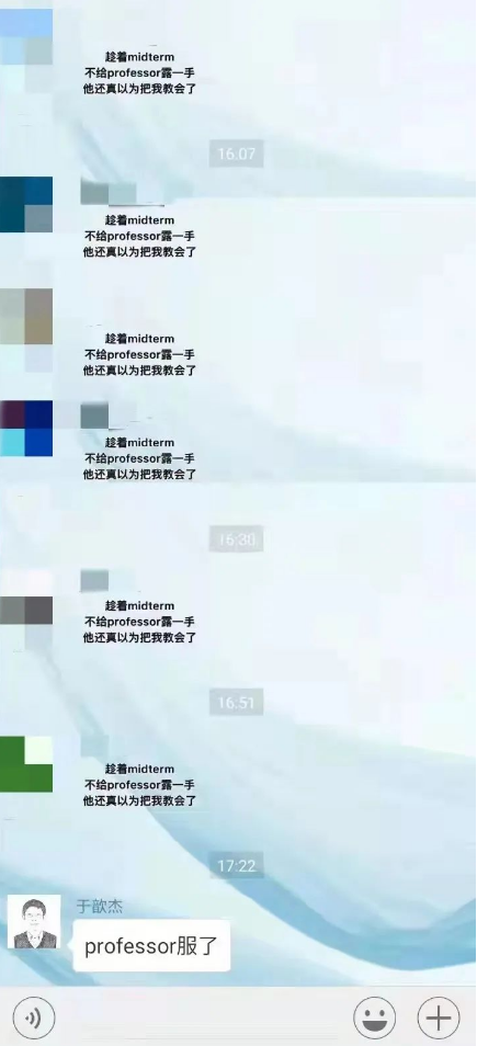 每次新學期伊始,于歆杰都會一個一個加上選課同學的微信,再一個一個把他們拉進課程群。很多其他課上助教做的事,他事事躬親卻覺得稀松平常。一百多人的大群,同學們插科打諢,他偶爾也會語出驚人。