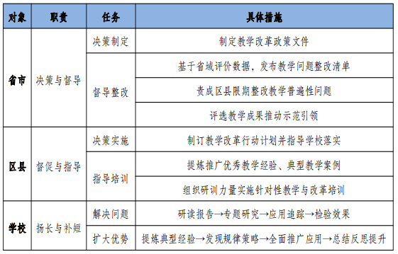 一是省市、區縣、學校分層推動教學改革與指導。省市、區縣、學校各級組織各負其責(見圖表3),基于評價反饋數據和報告,開展教學改革決策、督導、培訓、指導等,推動教學反思與改進。