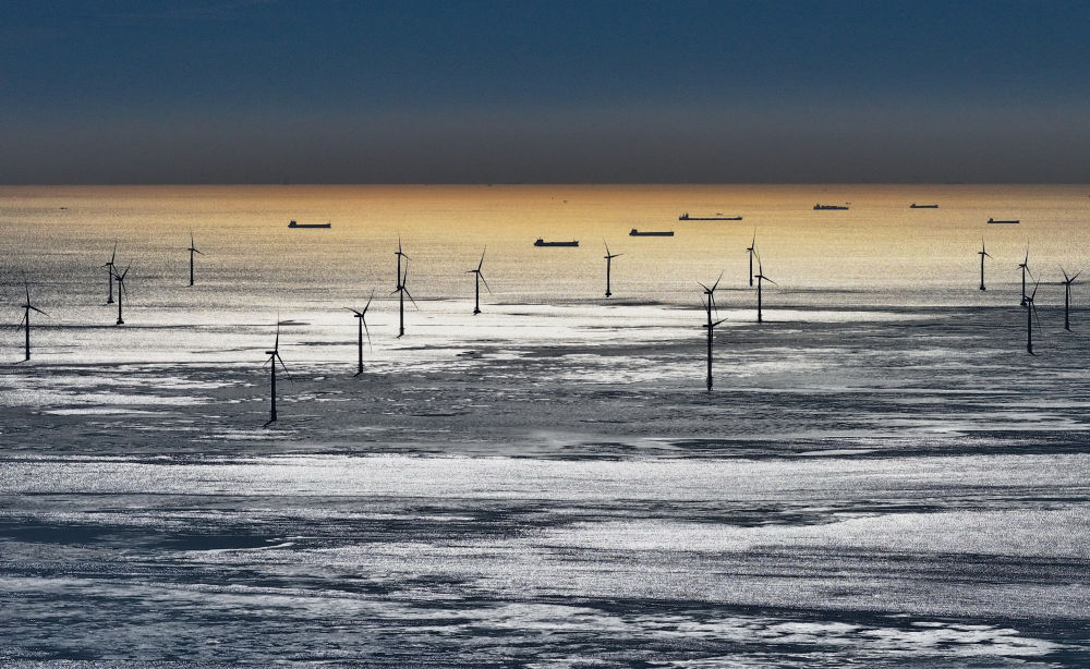 這是2023年12月22日拍攝的河北省唐山市海港經濟開發區轄區內的海上風電場(無人機照片)。