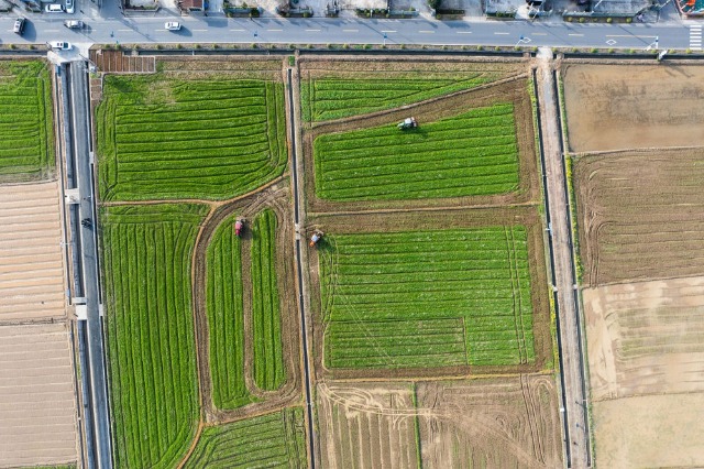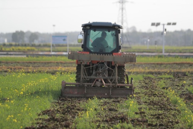 3月19日,在港中坪村,村民駕駛農機翻耕田地(無人機照片)。