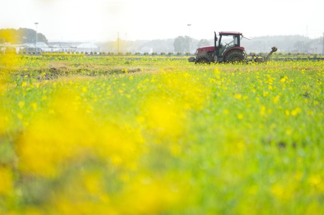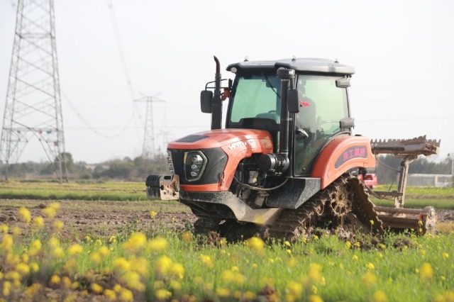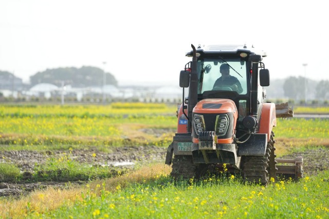 3月19日,在港中坪村,村民駕駛農機翻耕田地。