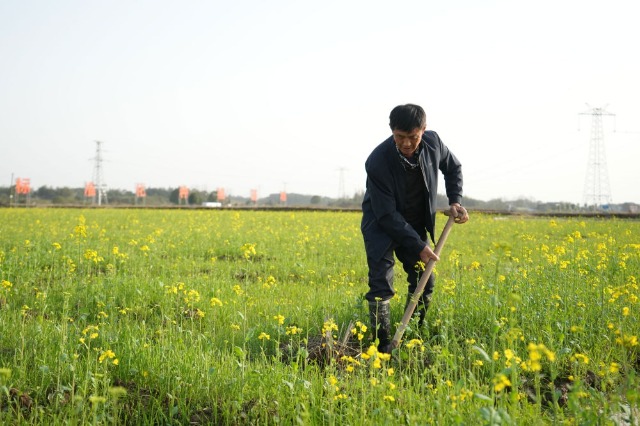 3月19日,在港中坪村,村民在疏通田間的水渠。