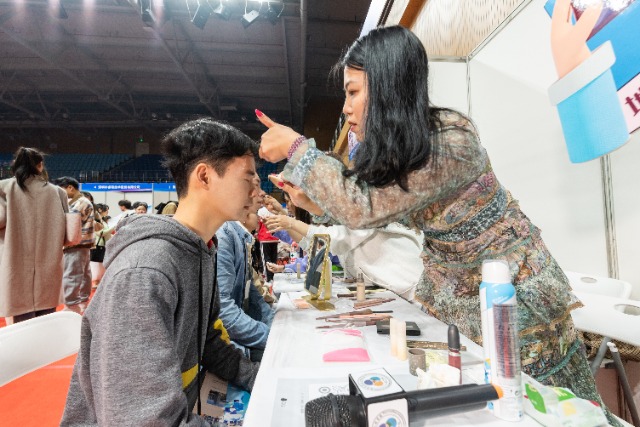 中國地質大學(武漢)輔導員張恪為現場求職畢業生化職業妝。學校供圖