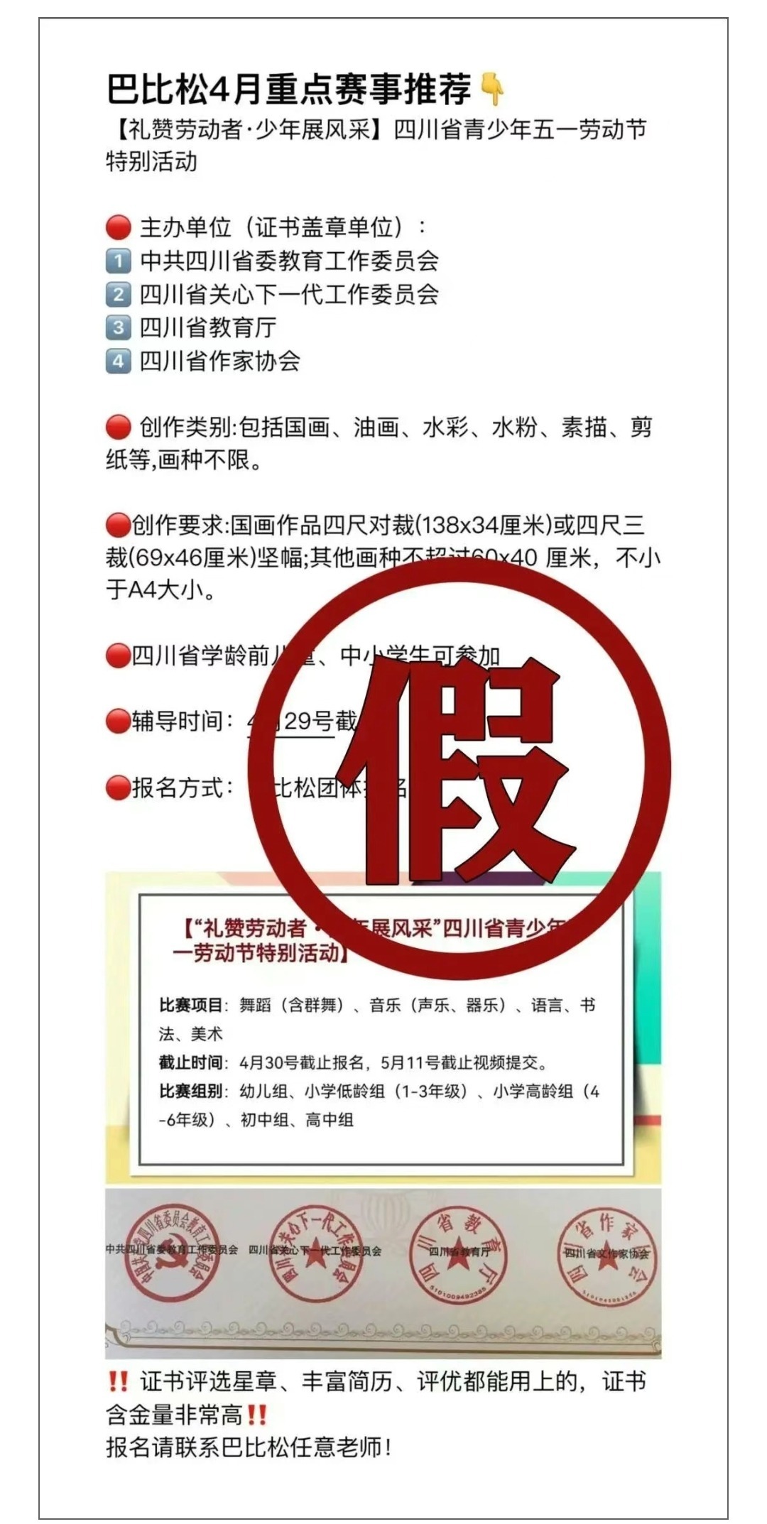 近日,四川省教育廳接群眾舉報,四川巴比松教育咨詢有限公司冒用“中共四川省委教育工作委員會、四川省教育廳”名義違規組織競賽,偽造公章,向家長進行虛假宣傳,并收取報名費、集訓費。