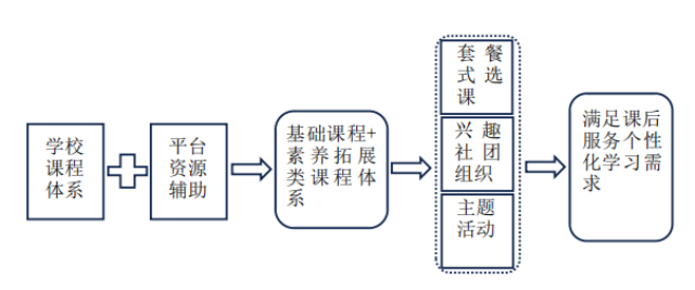 在學校自身的課程體系基礎上,應用平臺中的經典閱讀、科普教育、體育活動、藝術教育、影視教育、虛擬場館等場景資源,輔助學校開發拓展性課后服務課程,形成“立足基礎課程,開設多樣化素養拓展類課程”的校本課后服務課程體系。學校設立“套餐式”課后服務選課,通過興趣社團等多種形式,供學生根據自身學情、興趣、需求等選擇學習,以“基礎性指導+拓展性發展”的方式,滿足學生的個性化發展需求,促進學生綜合素養發展(見圖5)。