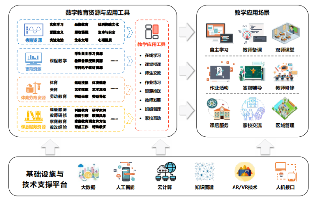 支撐學校教育環境的數字化轉型。長期以來,學校教育以基于班級授課制的線下集體教學為主,師生教學活動依托紙質教材、教具學具以及投影儀等基礎媒體設備開展,教學場所局限于教室這一封閉環境。依托各種數字教育平臺,教學場景逐步拓展為線上個性化自主學習,線上線下的混合式教學新空間應運而生。此外,VR、AR、元宇宙等虛擬數字技術進一步豐富了教育環境的存在形式,為師生打造了更多數字化、沉浸式、智能化的新型教育環境。