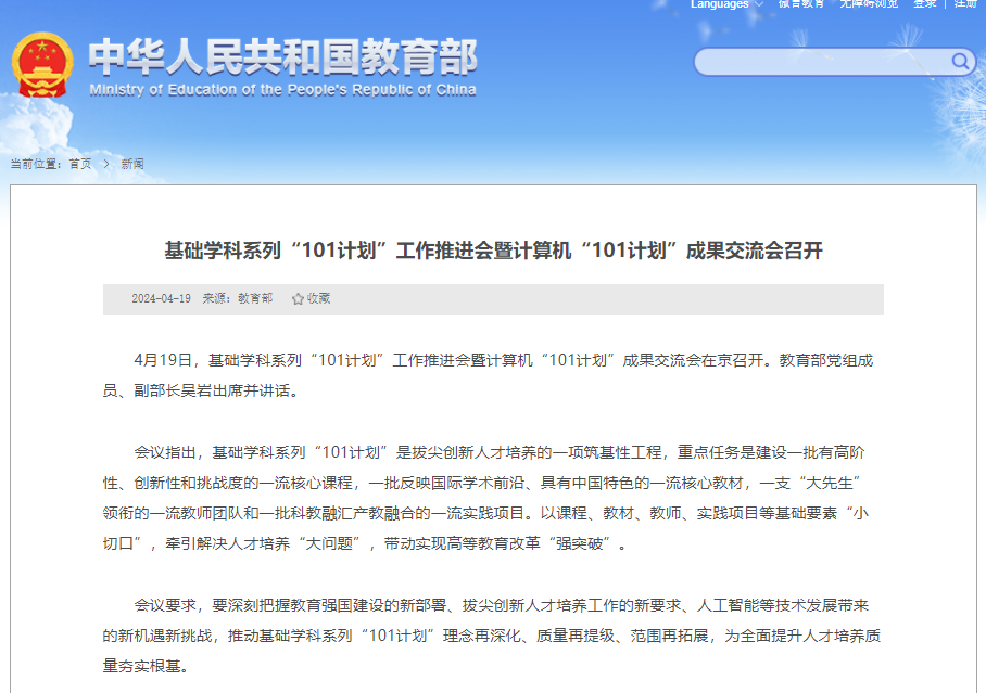 4月19日,基礎學科系列“101計劃”工作推進會暨計算機“101計劃”成果交流會在京召開。教育部黨組成員、副部長吳巖出席并講話。